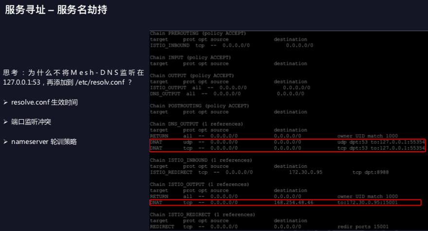 出于这三个方面的考虑,【采用 DNS 劫持】是一个比较合理的方案,具体可以看下,右图中 DNS 劫持的 iptables 规则,看下第一个红框,所有到 53 端口(也就是 DNS 请求)的流量被重定向到本地的 55354 端口,55354 端口运行就是 mesh-dns 服务;
