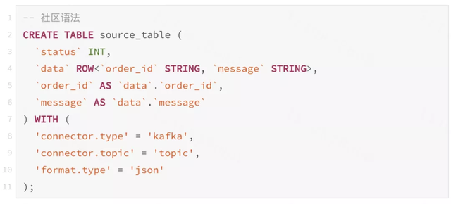 新版本上原生的 json 类型解析可以使用 ROW 类型来表示嵌套结构,在转换为新语法的过程中,将原本的表达是解析为树并构建出新的字段类型,再使用计算列的方式提取出原始表中的字段,确保表结构与之前一致。类型名称、配置属性也通过映射转换为社区语法。