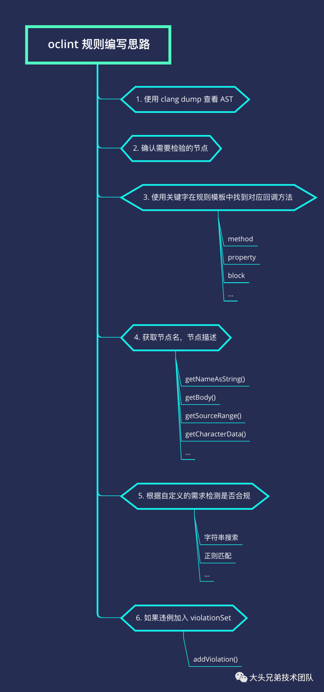 OCLint 本身是基于 Clang tool 的,换句话说相当于做了一层封装。它的核心能力是对 Clang AST 进行分析,最后输出违反规则的代码信息,并且导出指定格式的报告。