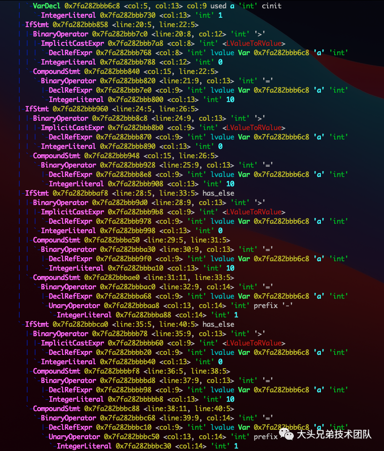 可以很清楚的看到,最上方的变量声明 VarDecl,以及下方的条件语句 IfStmt。