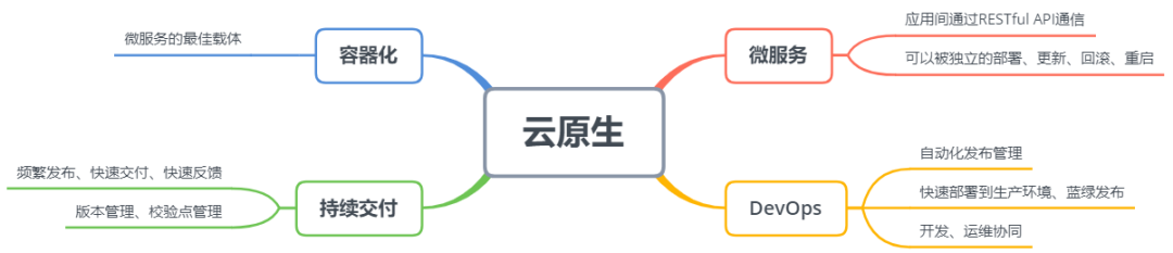这里作者结合民生银行基础技术栈,将云原生的建设思路抽象为按照微服务、容器化的架构设计应用、兼顾DevOps标准,满足持续交付基本诉求,即:云原生 = 微服务 + DevOps + 持续交付 + 容器化