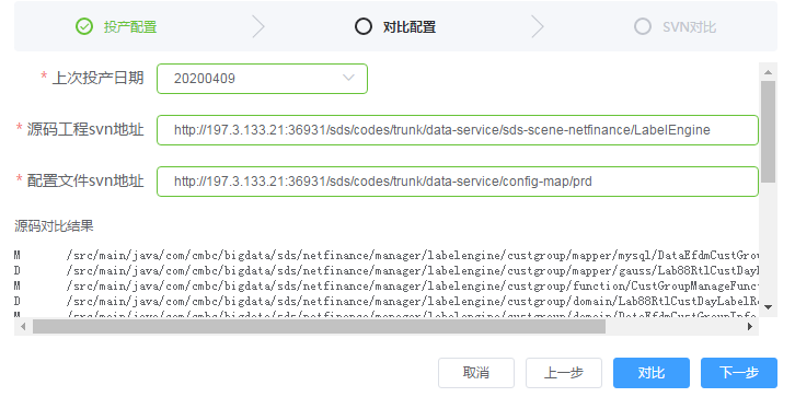 ②配置级别的Change List校验,提供任意两次版本间配置文件比对提示(新增、差异、缺失等)、文件内容差异化展示(键同值不同、键缺失、键新增等),人性化的设置了红黄警示,配置文件缺失、配置项缺失时用红色进行严重问题警告,配置值不相同用黄色进行一般性的提示。出现一项红色警示则为校验失败,中断后续流程。
