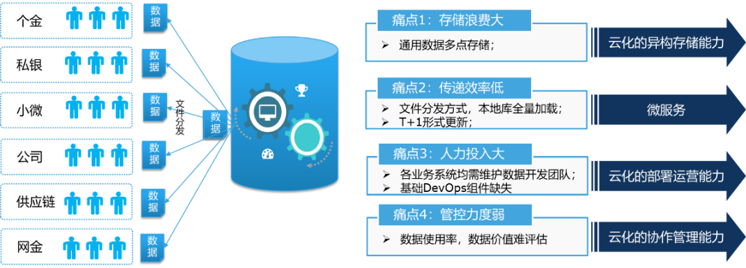 痛点2:传递效率低。文件式数据传递链路以T+1批量为主,数据需要“一股脑”全部加载进本地应用库后方可使用,数据获取的效率远低于通过服务“按需”调用获取指定内容(例如指定客户信息、指定机构指标),数据中台为了支持前端各具业务特色的数据应用场景,需要借助“微服务”解耦和组装;