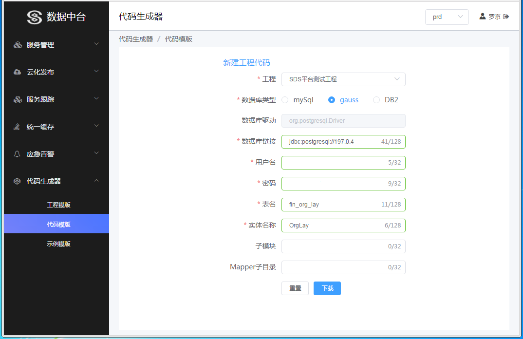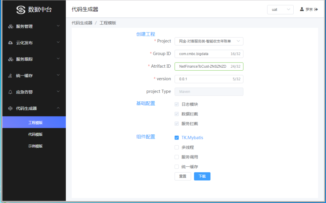 基于以上几点考量,数据中台提供了一套便捷的开发框架生成器和代码生成器,开发人员通过界面勾选方式选择该业务场景微服务所需要使用的基础功能(目前支持服务注册、日志模块、服务拦截、数据拦截、多线程模块、缓存模块等)和存储组件(目前支持MySQL、Redis、Gauss、SDB、HBase),代码生成器会直接生成包含所选功能、包含最优操作实践、可直接云化部署运行的工程代码,开发人员可以快速上手的同时,可以将更多的精力投入到核心业务逻辑的开发中。