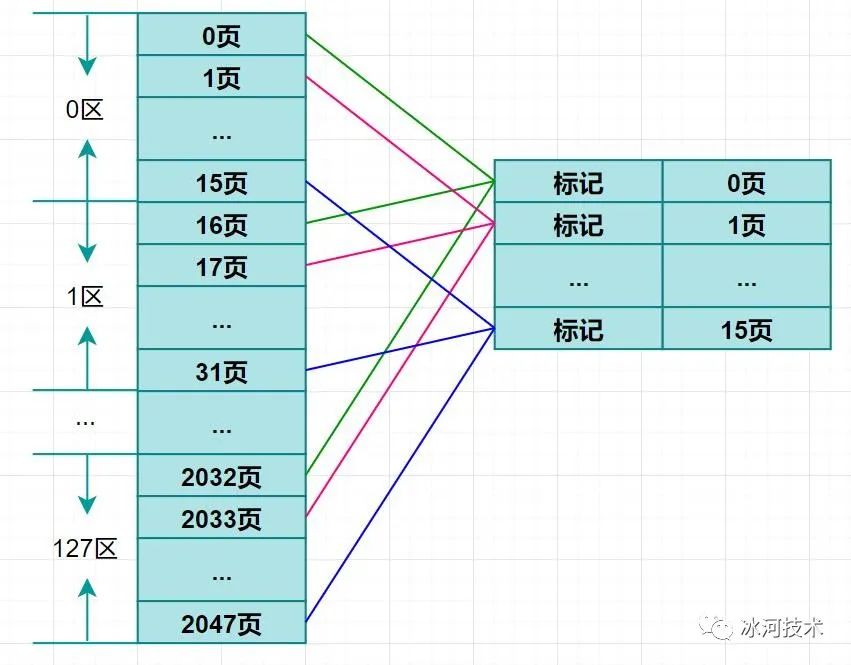 所谓直接相联映像是指Cache中的0页只能存储主存中0页的内容,这里主存中0页指的是每个区的0页,比如上图中的0区的0页,1区的16页,127区的2032页等。