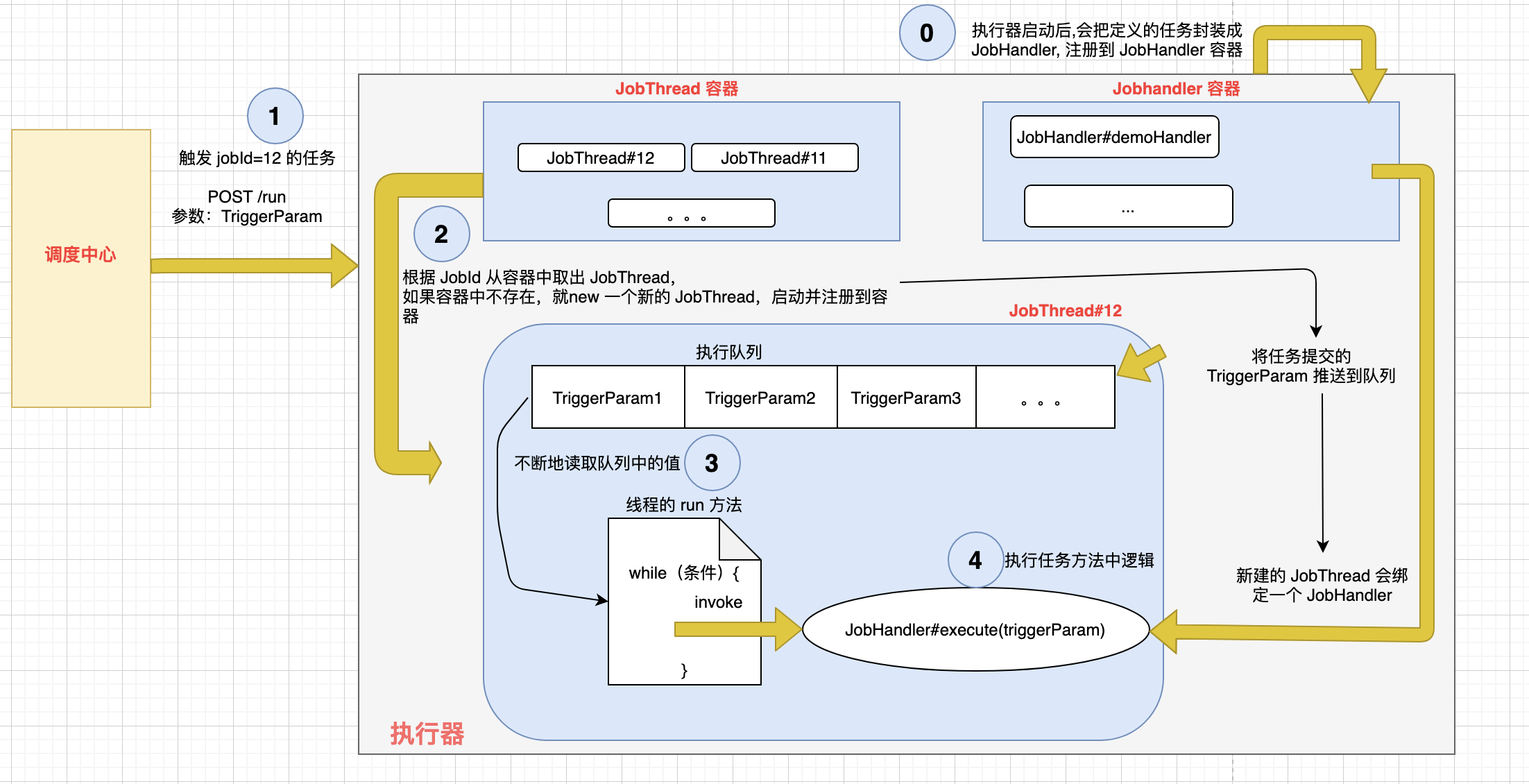 JobThread 中维护了一个队列, 任务每执行一次,就把执行参数推到该队列中,JobThread 启动后就一直从队列中读取执行参数,直到任务停止。