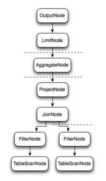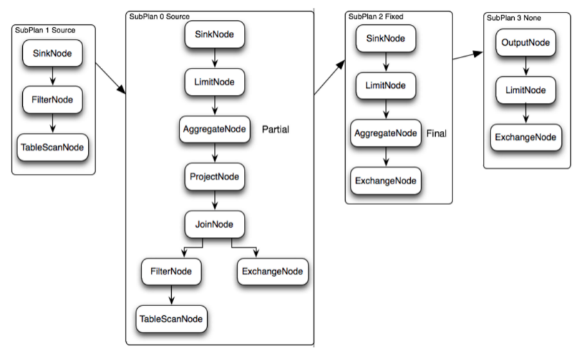上图中的执行计划被拆分成了 4 个子任务,每个任务都可以被提交到一个或者多个节点上执行。