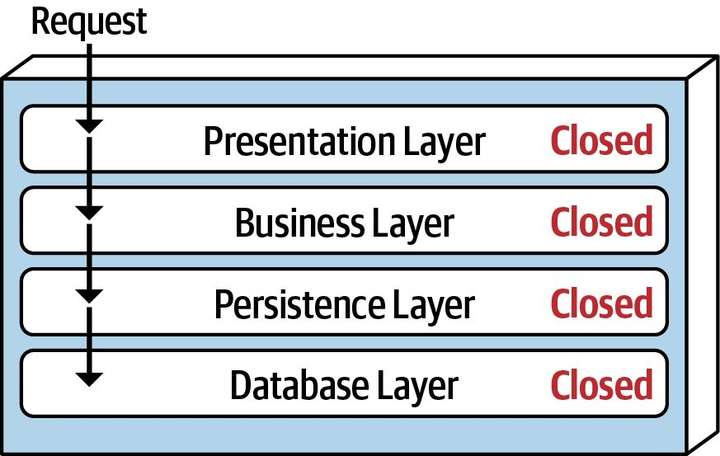 分层架构中的每一层可以是封闭的或者开放的,封闭意味着当一个请求自顶向下在层间传递时,它不能跳过任意的一层。比如,当表现层接收到请求之后,它必须先后经过业务层和持久层才能到达数据层,如下图所示。