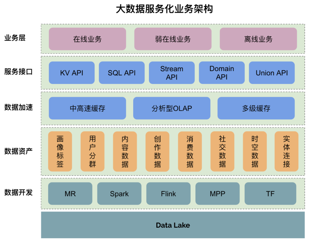 大数据服务化业务架构如下所示,Data Lake 数据湖中存储原始数据,经过数据开发之后,形成按主题域组织的数据资产。此时数据资产通常是在数据仓库,访问速度较慢,因此需要通过数据加速到更高速的存储介质,最后经过多场景服务接口,服务于业务。