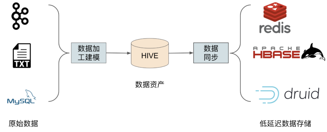 从多个数据源摄入原始数据(如Kafka,MySQL、线上访问日志等),进行加工建模后,得到数据资产。数据资产经由独立的数据同步服务,同步至其他更高速的存储引擎,如 redis、hbase、druid等。数据同步支持一次性或者周期性(小时、天、周等)将数据从Hive同步至其他存储中,数据同步本身是基于分布式的调度系统,内核是基于 datax 进行数据同步。大数据服务化平台单日同步的数据量达到1200亿条,数据size达到20TB。