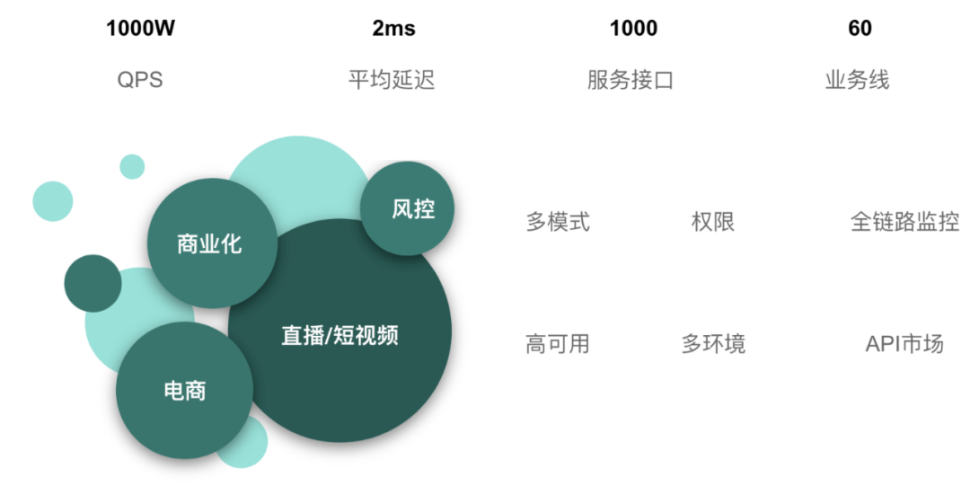 大数据服务化平台从2017年演化至今,已经支持多类应用场景,涵盖直播、短视频、电商、商业化等在线业务,生产者中台等准在线业务,运营系统等偏内部数据系统等,目前平台在线业务总 QPS 达到 1000W,平均延迟在毫秒级;对于准在线业务和内部数据系统,基于CH、Druid等多种数据引擎,支持多种灵活查询。数据服务平台支持了多种模式API,很好满足了多元化需求。此外数据服务平台也支持服务权限、API市场等丰富功能,进一步赋能业务。