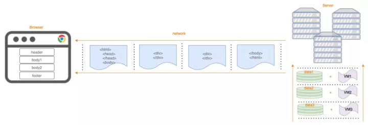 流式输出就比较神奇,源自于团队内部在一次性能大赛结束后的总结中产生,是基于流式的理论基础在页面渲染以及渲染的HTML在网络传输中的具体应用而诞生,也有人也简单的称之为流式渲染。即:将页面拆分成独立的几部分模块,每个模块有单独的数据源和单独的页面模板,在server端流式的操作每个模块进行业务逻辑处理和页面模板的渲染,然后流式的将渲染出来的HTML输出到网络中,接着分块的HTML数据在网络中传输,接着流式的分块的HTML在浏览器逐个渲染展示。具体流程如下: