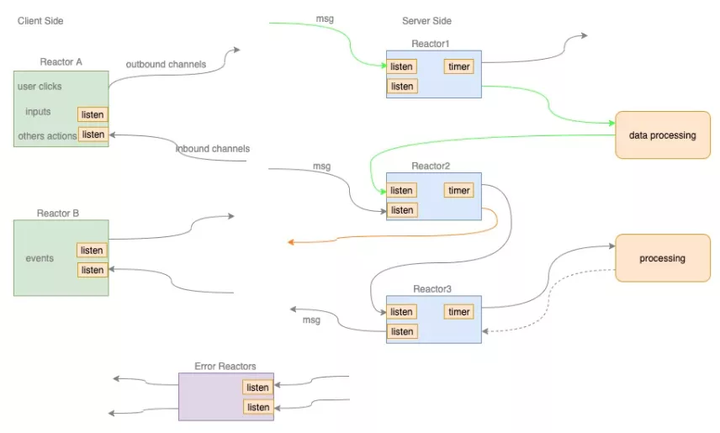 这也就是Reactive的内涵。我们把处理和发出事件的主体称为Reactor,它可以接收事件并处理,也可以在处理完事件后,发出下一个事件给其他Reactor。