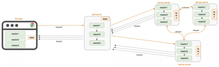 基于流式输出,我们再深入一点,可以发现其实不只是用户端和web server之间的数据可以在网络上进行流式输出,微服务的各个server之间的数据其实也可以在网络上进行流式输出,如下图所示:
