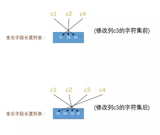修改该列字符集后记录的变长字段长度列表也发生了变化,如图: