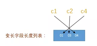 record_format_demo表的c1、c2、c4列的类型是VARCHAR(10),而c3列的类型是CHAR(10),我们说在Compact行格式下只会把变成类型的列的长度逆序存到变长字段长度列表中,就像这样: