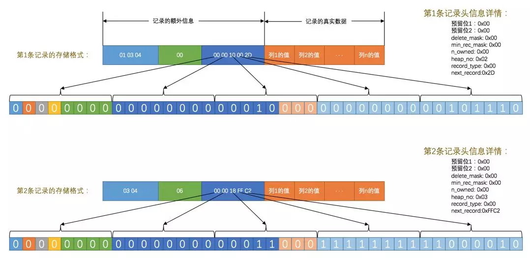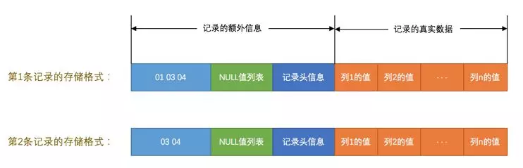 大家从图中可以看出来,一条完整的记录其实可以被分为记录的额外信息和记录的真实数据两大部分,下边我们详细看一下这两部分的组成。