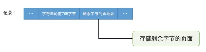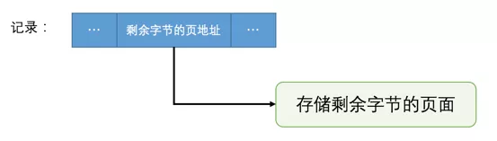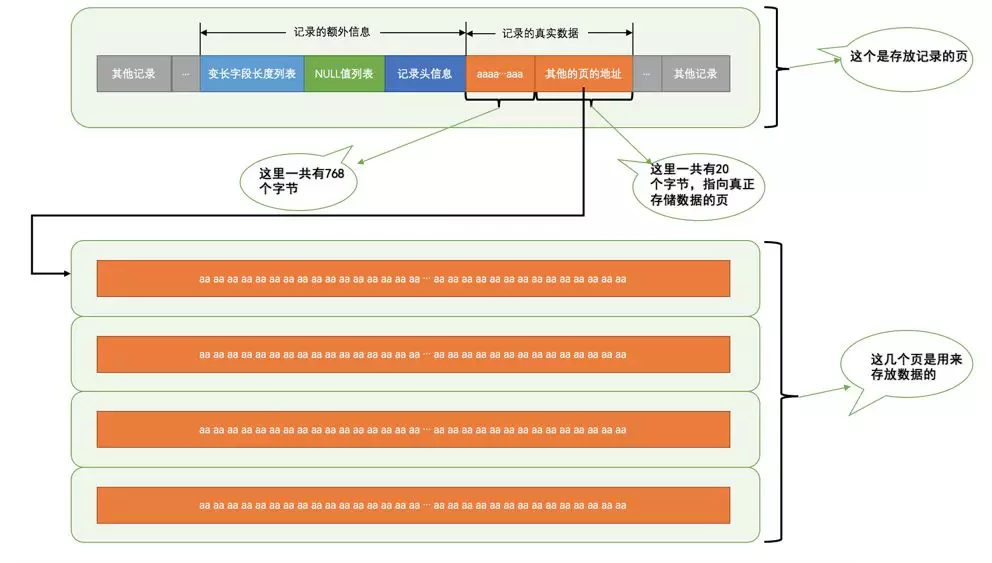 在Compact和Reduntant行格式中,对于占用存储空间非常大的列,在记录的真实数据处只会存储该列的一部分数据,把剩余的数据分散存储在几个连续的页中,只在记录的真实数据处用20个字节存储指向这些页的地址,从而可以找到剩余数据所在的页,如图所示: