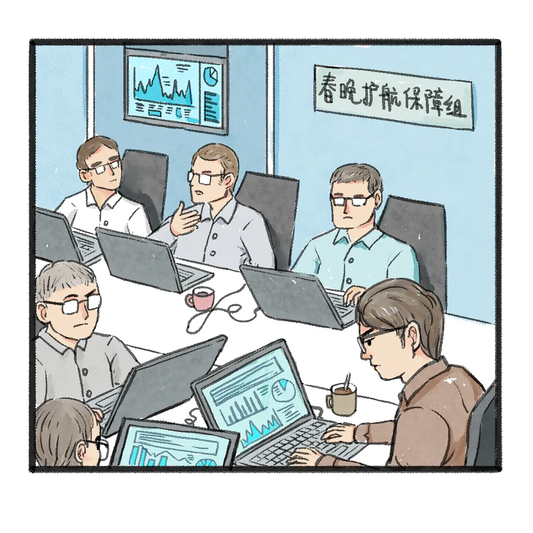 春晚前一周,差不多小年前后,我们就会到现场进行预演,央视网专门给我们在望海楼负一层开辟出一间 “春晚护航保障组” 的会议室,会议室正前方是一张用来观看春晚直播的大屏,旁边还有一张小屏幕实时呈现春晚直播流量的变化。