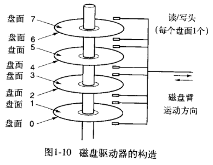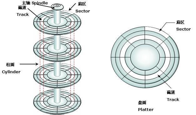 在一个磁盘中有一个或多个金属「盘片」,它们以 5400、7200、10800 rpm 或更高的速度旋转。从边缘开始有一个「机械臂」悬横在盘面上,这种情形大伙可以回想一下老式的播放塑料唱片机。信息会写在磁盘一系列的同心圆上。在任意一个给定臂的位置,每个「磁头」可以读取一段环形区域,称为「磁道」(track)。把一个给定臂的位置上的所有磁道合并起来,就组成了一个「柱面」(cylinder)。