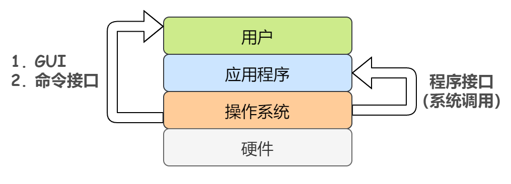 这就引出了操作系统的第二个主要功能:「为用户提供一个友好、清晰且简单的操作界面」(专业的叫法是 「壳 Shell」),用户通过 Shell 执行该操作系统提供的所有的功能。对于命令行来说,就需要提供足够多的命令;对于图形界面来说,就需要提供足够多数量的按钮。