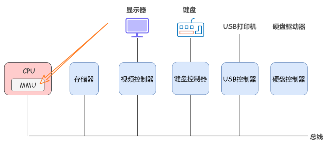 空分复用技术的原理就是把内存作为高速缓存来使用,只用来保存最频繁使用的部分程序,而把程序的大部分放在磁盘上。这种机制需要快速的映像内存地址,以便把程序生成的地址转换为有关字节在内存中的物理地址。这种映像由 CPU 中的一个部件,称为「存储器管理单元」(Memory Management Unit,「MMU」)来完成,这张图上面我们也看过了,回顾一遍: