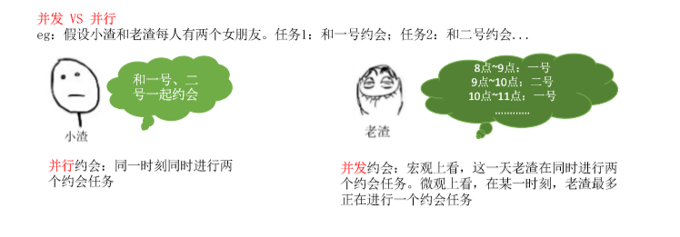 举个例子:老渣在 8 点 和 12 点要和两个女孩并发约会,每个女孩的约会时间是 2 小时,与一、二号的约会就是两道并发执行的程序,而老渣的心则是有限的系统资源。