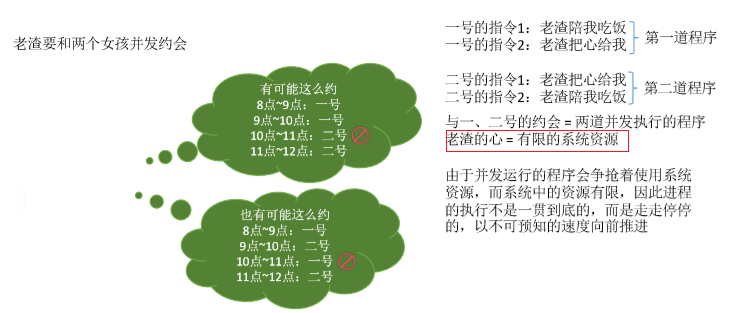 由于并发运行的程序会争抢使用系统资源,而系统中的资源有限,那么老渣同一号或二号的 2 小时约会时间就可能无法一次性结束,而是断断续续的。可能 8 点到 9 点和一号约会,9 点到10 点和二号约会,然后 10 点到 11 点再和一号约会,最后 11 点到 12 点和二号约会。