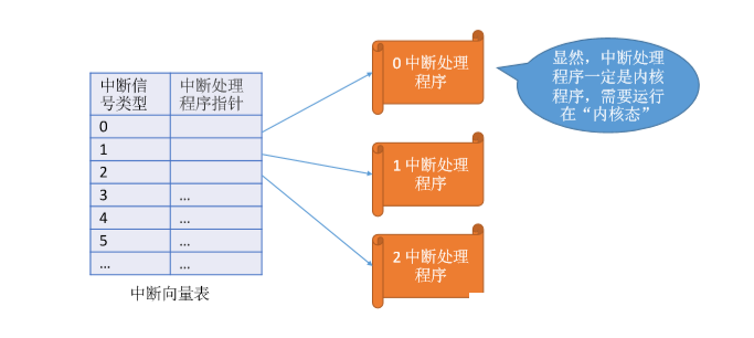 这里简单解释一下「中断机制的基本原理」:不同的中断信号,肯定是需要用不同的中断处理程序来处理的。那么当 CPU 检测到中断信号后,就会根据中断信号的类型去查询「中断向量表」,以此来找到相应的中断处理程序在内存中的存放位置。
