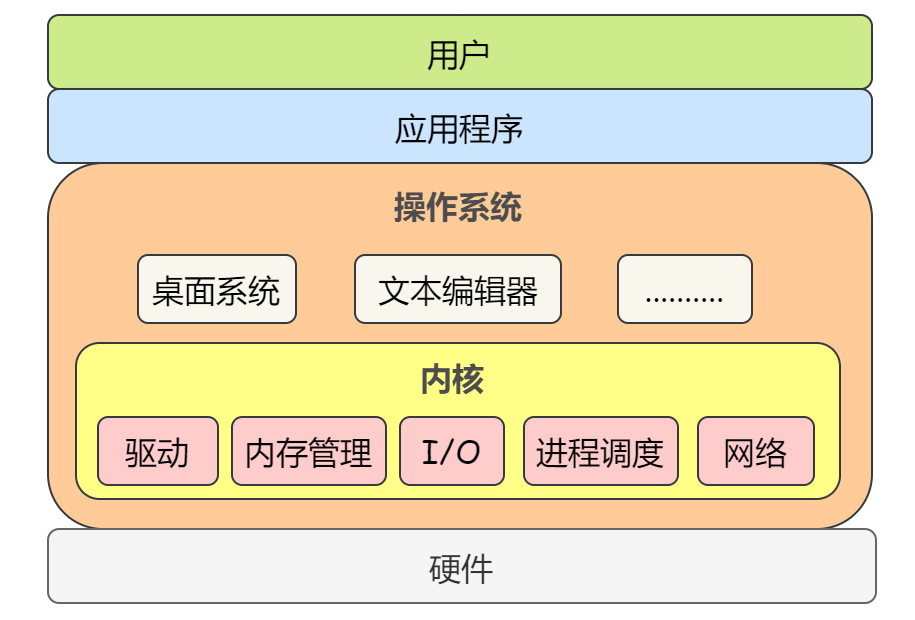 内核这个专有名词可能会让大家有点懵逼。这里解释一下。现代操作系统都采用进程的概念,为了更好的处理系统的并发性、共享性等,并使进程能够协调地工作,仅依靠计算机硬件提供的功能是远远不够的。例如,进程的调度就不能用硬件来实现,必须使用一组基本软件对硬件资源进行改造,以便为进程的执行提供良好的运行环境,这个软件就是内核(kernel)。