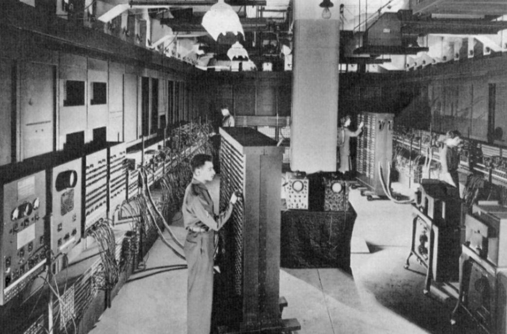 1946 年,「世界上第一台通用计算机埃尼阿克(ENIAC)「在美国宾夕法尼亚大学诞生,用了 18000 个电子管,占地 170 平方米,重达 30 吨。最恐怖的是,ENIAC 或者说」早期的计算机是没有操作系统的」,运转这个 170 平方米的庞然大物全靠工程师们的手动操作。大概是种什么感觉呢?请看下图: