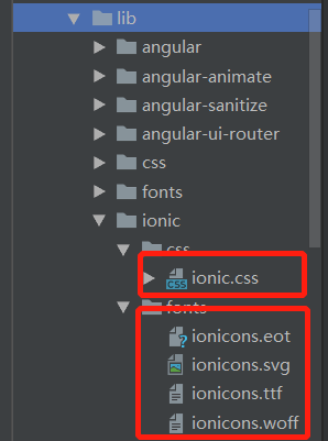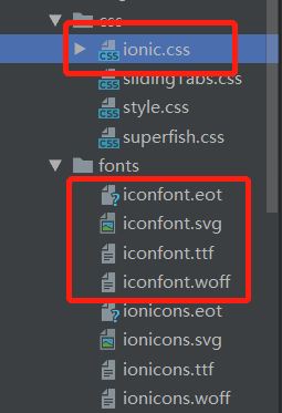 11、将4份字体文件放入项目fonts文件夹内,将CSS中使用到的图标放入到ionic.css中