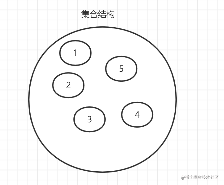 集合结构,这个数据结构是指这个结构内的所有数据元素,唯一的特性是除了同属于一个集合,之外再也没有任何关系了。