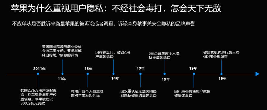 崇高使命也许现在是有的,也是其一直宣扬的,但其形成却是在各种负面事件和商业利益中逐步演变成今天的样子的。2015年把隐私作为核心价值观的“人设”一旦树立,则苹果在隐私保护上的投入无论是主动还是被动(安全事件),都只能继续下去,因为打破人设的代价无异于摧毁一个品牌。