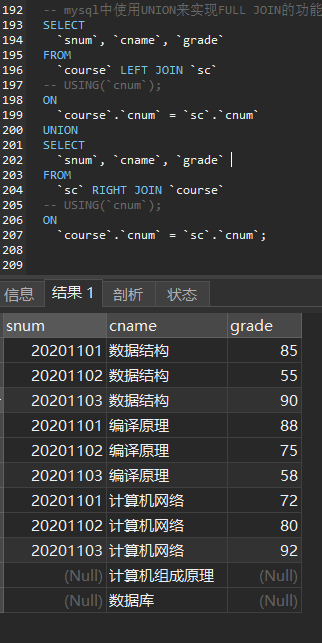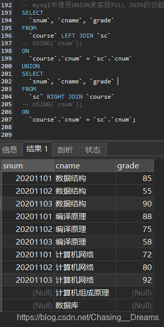 全连接在进行多表联合查询时通过full join.. on ”关键字来连接多张表之间符合条件的字段,其查询的结果除了会返回左右表匹配的数据,还会返回两个表的所有行。但是mysql中没有全连接,也可以使用"UNION " 来实现full join 功能,union 连接左右外连接。