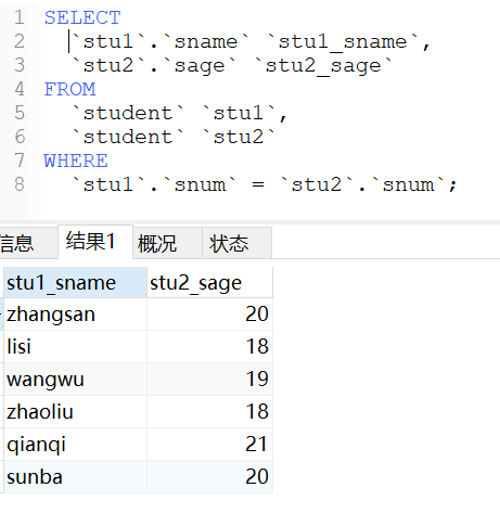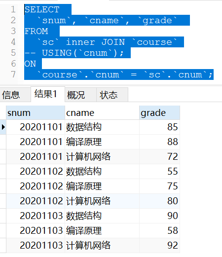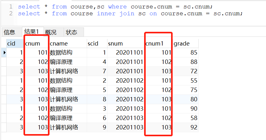 等值连接也称为显示内连接,在进行多表联合查询时通过“=”等号来连接多张表之间相字段对应的值,其产生的结果会出现重复列。意思是,如果对多张表进行等值连接操作,那么前提要求是这多张表之间必须有相同的字段名。比如上述表中,课程表和学生课程中间表均有相同的“cnum”字段,学生表与学生课程中间表均有相同的“snum”字段。