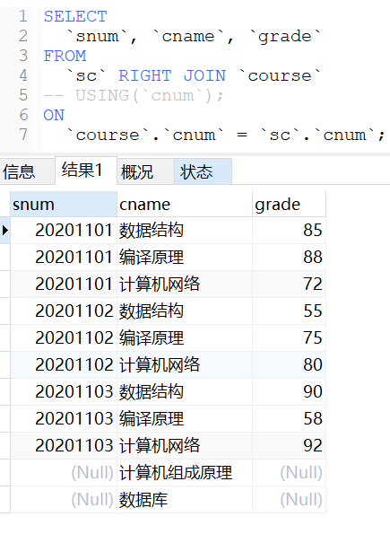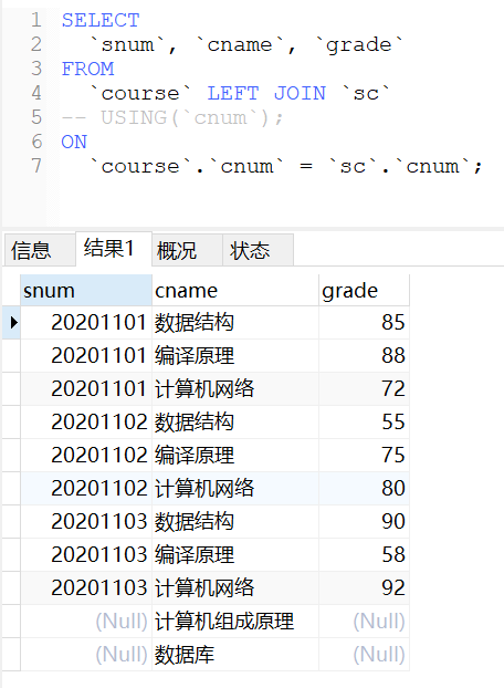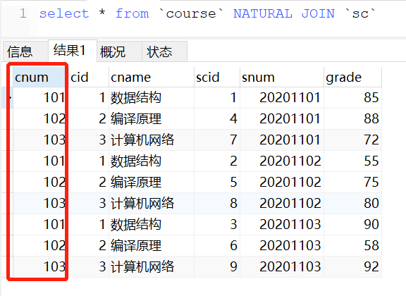 自然连接是一种特殊的等值连接,在进行多表联合查询时通过“natural join”关键字来连接多张表之间相同字段对应的值,其产生的结果会将重复列只保留一个。如果对多张表进行自然连接操作,那么前提要求是这多张表之间必须有相同的字段名。比如上述表中,课程表和学生课程中间表均有相同的“cnum”字段,学生表与学生课程中间表均有相同的“snum”字段。