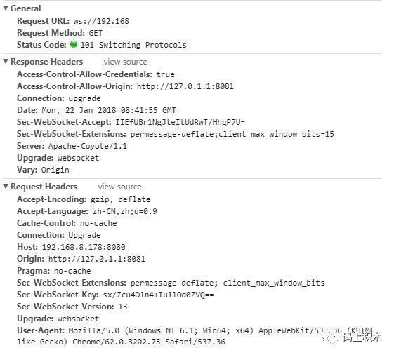 响应码101,表示响应协议升级,后续的数据交互都按照Upgradet指定的WebSocket协议来。
