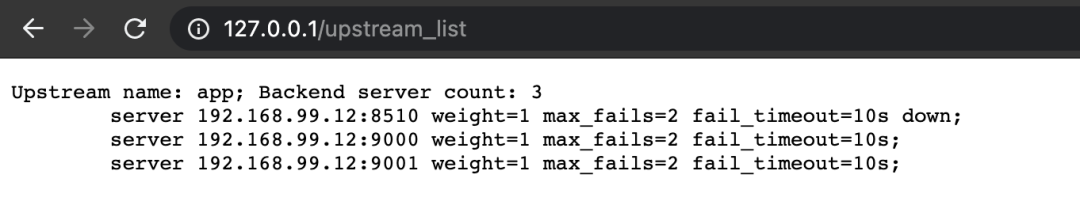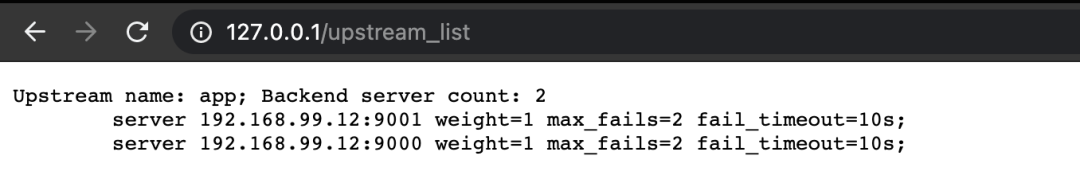 容器运行正常后,就可以通过http://127.0.0.1/upstream_list查看upstream主机了,此时app.conf的内容也会被动态的更新,这里可以作为consul故障后的备份配置文件
