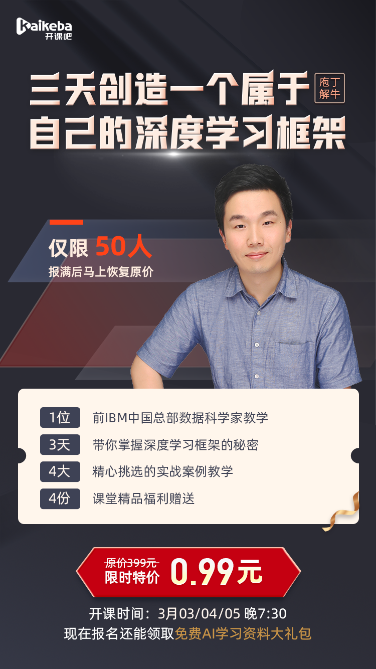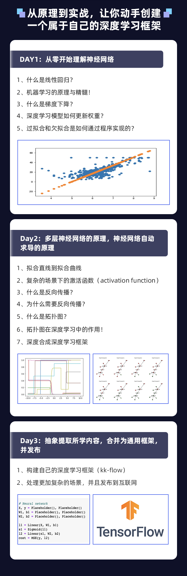 通过3天的《用纯Python从零创造自己的深度学习框架》,了解人工智能体系及整体框架结构,用最短的时间一次性掌握深度学习的原理与核心思维方法,深入理解人工智能框架的构成与演化原理。
