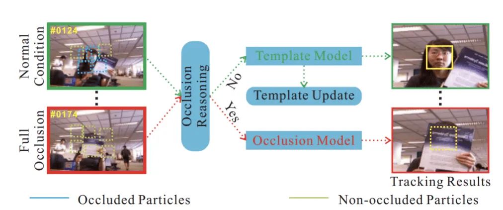 OAPF框架。应用了带有遮挡处理的粒子滤波方法,其中遮挡模型是针对模板模型构造的。当目标被遮挡时,遮挡模型用于预测位置而无需更新模板模型: