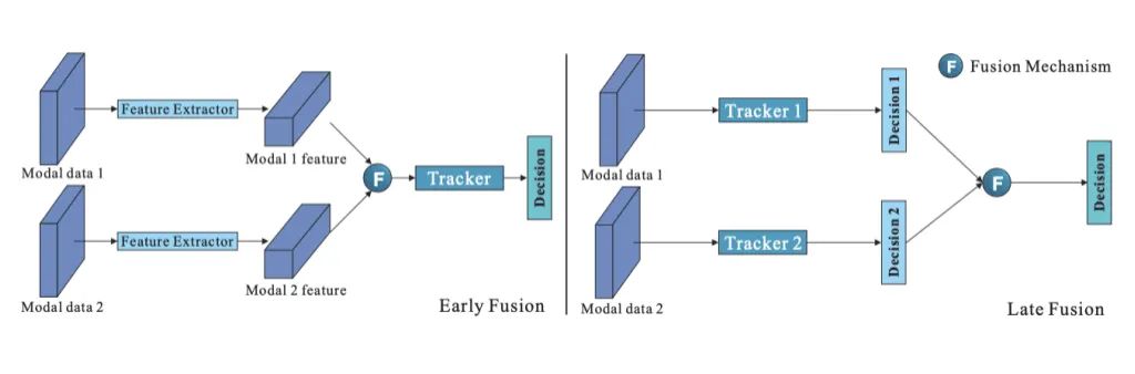 早期融合(EF)和晚期融合(LF)的工作流程。基于EF的方法进行特征融合并共同建模;而基于LF的方法旨在分别为每个模态建模,然后组合其决策: