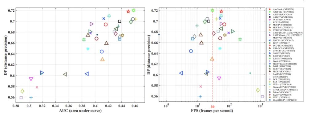 在无人机追踪基准[UAVDT]下,基于DCF的追踪器和深度追踪器的性能比较。图例中带有*的跟踪器是在GPU上运行的结果,该GPU利用GPU加速了卷积和池计算。当跟踪速度在单个CPU上达到红色虚线(30FPS)时,就可以满足无人机实时跟踪的要求: