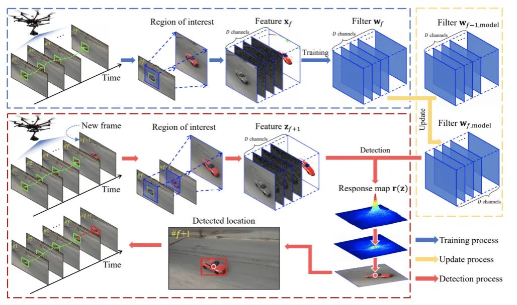 无人机平台上基于DCF的方法的一般跟踪结构,可分为训练阶段,模型更新和检测阶段:
