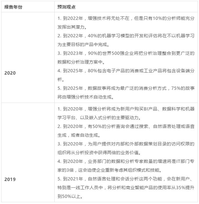 结合报告的预测观点和市场描述,不难看出增强分析(Augmented Analytics)和企业报告是分析与BI平台的主要趋势。报告认为,分析与BI平台的差异将不再体现在其数据可视化功能上,这些功能正在成为“日用品”,而差异化正在转向企业报告功能的集成支持和增强分析上。
