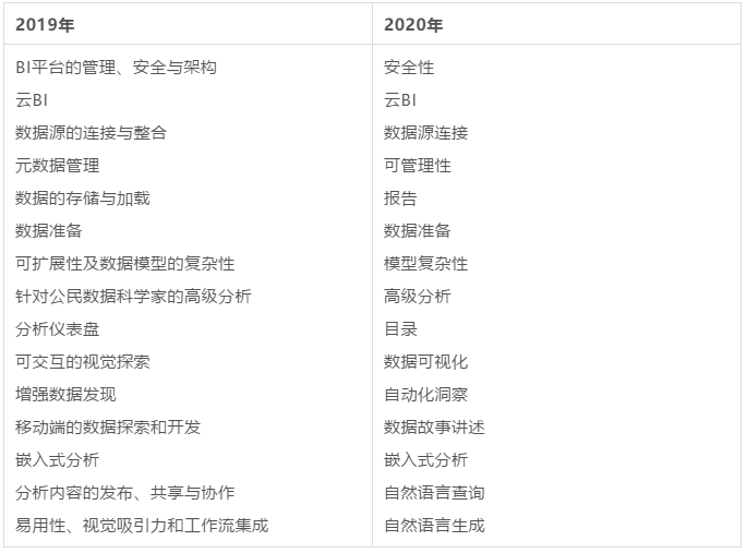 报告对15项关键功能进行了较大的更新调整,其中最主要的功能更新为安全性、报告、增强分析。笔者将2019和2020两年各自的15项关键功能一起整理在表2中。
