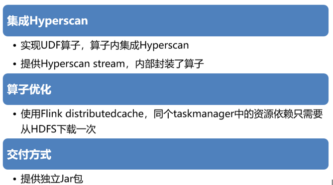 该解决方案实现了一个自定义的UDF算子,算子支持指定只匹配输入数据中的某几个字段,算子的输出是待匹配的字段文本,匹配最终状态,包括命中,不命中,错误,超时四种状态,如果是命中的状态,那么还会返回匹配中的正则表达式的id,输出还包括输入原始数据,如果有后续处理,这样不受影响;为了进一步方便用户使用,扩展了一个新的datastream,称之为Hyperscanstream,它把算子封装进了进去,用户在使用时只需要把datastream转换为Hyperscanstream,然后通过调用一个方法就可以使用正则的算子了。整个解决方案以一个独立的jar包提供给用户,这样可以保持原来编写Flink作业的习惯,并且与Flink的核心框架解耦。