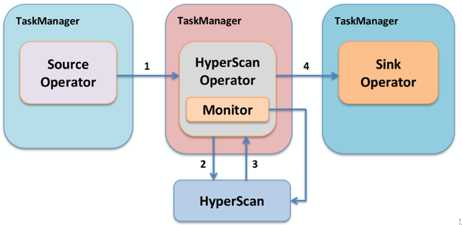 数据流转的过程是这样,数据源读取到一条记录后交给下游的Hyperscan算子,Hyperscan算子把数据交给Hyperscan子进程,子进程匹配完成后把结果返回给Hyperscan算子,然后Hyperscan算子把原始记录和匹配的结果传递给后续算子。
