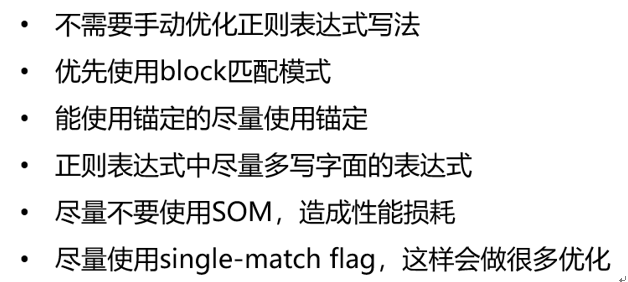 • 支持大部分PCRE正则语法(如果使用Chimera库,那将支持所有语法)