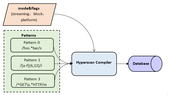 和大多数正则引擎类似,Hyperscan也包括编译和匹配阶段,编译是把正则表达式解析然后构建成内部需要的database,后续可以多次使用这个database去匹配;如果是多模匹配,编译时每个正则表达式需要有一个唯一的标识id,id在匹配的时候会用到。编译过程如下图所示: